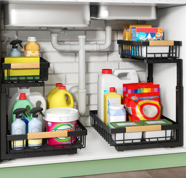 Transforms chaotic sink cabinets into structured storage for cleaning supplies.