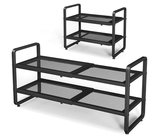 Doubles vertical shelf space instantly by stacking items without creating clutter.