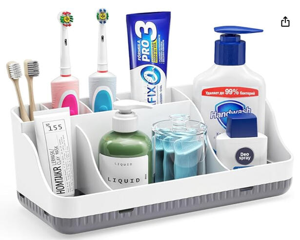 Stores toothbrushes, toothpaste, and small items in one hygienic station.
