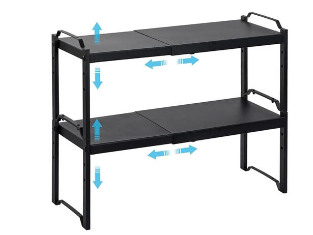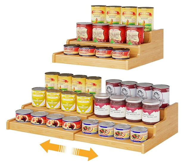 Adjusts to fit different cabinet widths while creating tiered visibility for cans and jars.