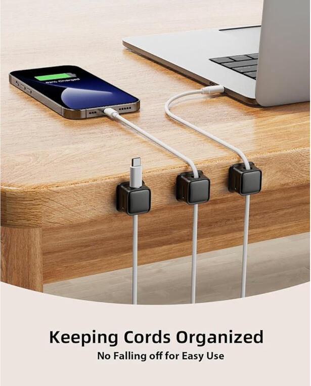 Prevents cables from falling and tangling, keeping your desk visually clean and efficient.