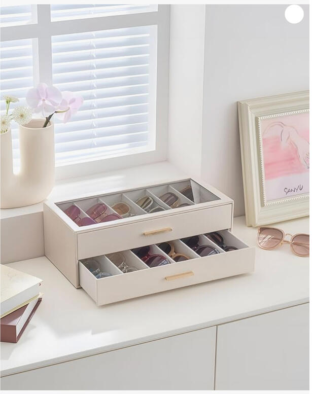 Protects from dust and damage, and displays eyewear in a compact, aesthetic layout.
