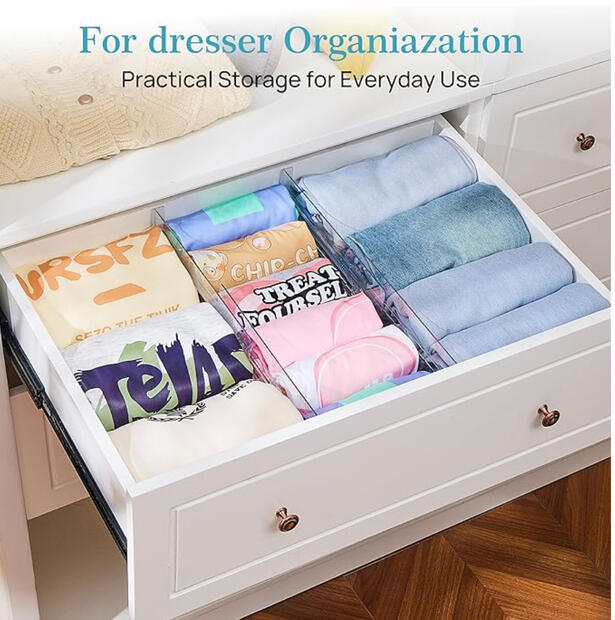 Keeps stacked clothing neat and separated so piles don’t collapse.