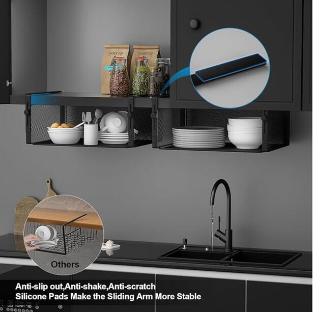 Adds hidden storage beneath cabinet shelves for small kitchen items.